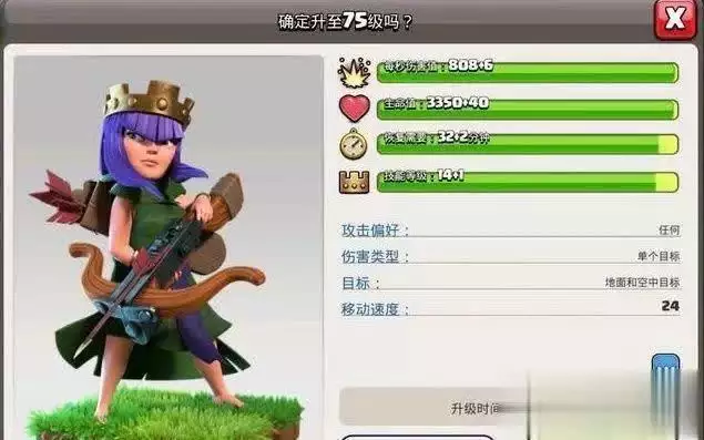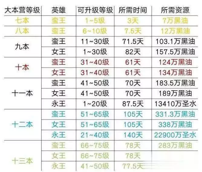 11本到13本:弓箭女皇从40级到75级需要910W黑油,时间约248天;蛮王从45级到75级需要797.5W黑油、233天;大守护者从1级到50级需要5.23亿圣水、303天;飞盾战神从1级到20级则需要423W黑油、96.5天。