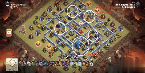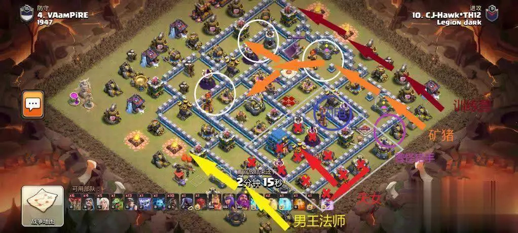 首先观察阵型,选择矿猪流并确定进攻路线。(我无法详细讲解为何选择矿猪以及为何如此规划路线。但只要你关注我,认真记住我的细节与思路,并多进行实战,日后你自己便能学会看阵选流派。防御科技排名可以靠资源堆积,唯有技术需要时间来磨练。)