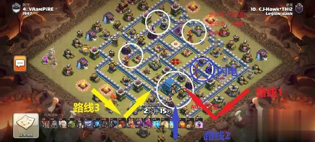如此看来,似乎怎么打都不行,难道就不用矿猪了吗?实则不然,真正优秀的阵型会让人一时难以找到突破口,但再好的阵也并非无懈可击。闪电能帮你解决难题。显然,路线1是相对较好的选择。若用闪电提前处理多头塔与火箭,路线1就成为了最优路线。