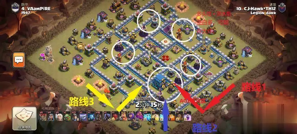 路线1:优点在于断边便捷,能避开吹风机,处理完大本后可直接攻打鸟炮,为矿猪规划出路线。缺点是路线处于多头塔和火箭的攻击范围内,天使容易快速死亡。